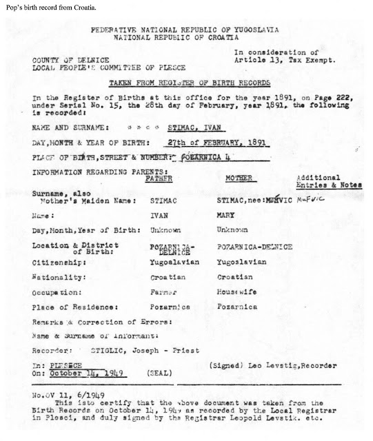 Pop's mother died on the day she learned that Pop had married Mary. It's been surmised that she was very upset because she knew that when Pop married in the United States that he probably would not be returning home to Croatia. However, Pop's older brother, Anthony, had sent all the money he had earned home to his wife in Croatia and eventually he returned there. Unfortunately, World War I broke out and Anthony was captured and sent to a Prisoner-of-War camp where he died of lice infestation and disease. Pop's father died the same year.